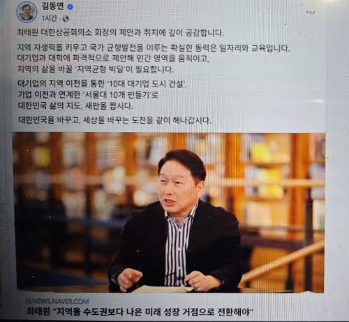 한편 김동연 지사는 최태원 대한상공회의소 회장이 메가샌드 좌담회에서 밝힌 “지역을 수도권보다 나은 미래 성장 거점으로 전환해야”라는 제하의 연합뉴스 기사를 링크해 올렸다.
