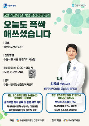 (경기=NSP통신) 조현철 기자 = 경기 수원시행복정신건강복지센터는 5월 가정의 달을 맞아 시민 대상 정신건강 무료 강좌 ‘오늘도 폭싹 애쓰셨습니다’를 연다.