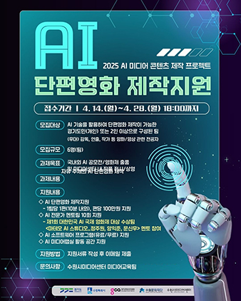 경기도에 거주(소재)하며 AI 기술을 활용하는 창작자를 위한 ‘AI 단편영화 제작지원’ 사업도 진행한다. 해당 사업은 ‘AI 미디어 콘텐츠 제작 프로젝트’의 일환으로 AI 기술과 영화 장르를 융합해 독창적이고 실험적인 아이디어를 가진 창작자들에게 새로운 기회를 제공한다.