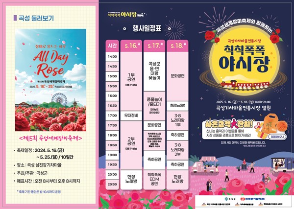 곡성세계장미축제와 연계해 진행되는 이번 행사는 곡성 전통시장 만의 개성과 문화를 담은 ‘테마형 야시장’으로, 먹거리, 공연, 체험, 주민 참여 이벤트가 어우러진 복합형 장터로 운영된다.