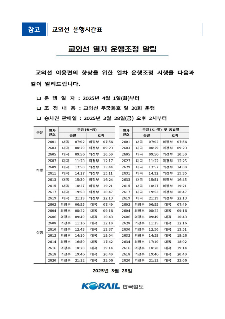 주말(토·일) 및 공휴일 운행시간 관련해 첫차시간과 막차시간은 동일하지만 낮시간대는 서로 다르게 운행된다. 변경된 시간표는 코레일 누리집에서 확인할 수 있다.