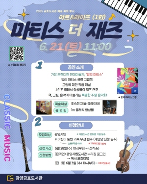 (전남=NSP통신) 김성철 기자 = 광양금호도서관이 일상에서 예술가와 작품을 느낄 수 있도록 기획한 예술 특강 시리즈‘아트 앤 라이프’를 오는 6월~9월까지 운영한다.