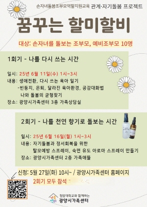 박정금 여성가족과장은 “손자녀를 돌보는 조부모가 이번 교육을 통해 본인 스스로도 돌보며 가족 관계 속에서 정서적 회복의 기회를 가지길 바란다”며 “앞으로도 가족 구성원 간 의사소통 활성화와 정서적 유대감 강화를 위해 다양한 서비스를 지속적으로 제공하겠다”고 말했다.