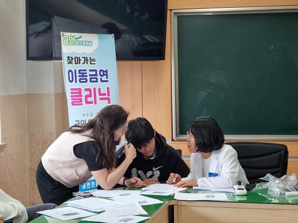 이번 이동 금연클리닉은 몽골유학생 8명이 참여 언어 소통의 어려움에도 불구하고 학교 내 통역교사의 협조로 원활한 상담과 교육이 이뤄졌다.