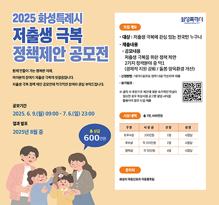 (경기=NSP통신) 조현철 기자 = 경기 화성시(시장 정명근)가 저출생 문제 해결을 위한 시민들의 창의적인 아이디어를 발굴하고자 ‘2025년 화성시 저출생 극복 정책 제안 공모전’을 개최한다.
