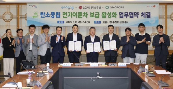 NSP통신-포항시는 17일 시청 중회의실에서 LG에너지솔루션, 큐모터스와 탄소중립 전기이륜차 보급 활성화를 위한 업무협약을 체결했다. (사진 = 포항시)