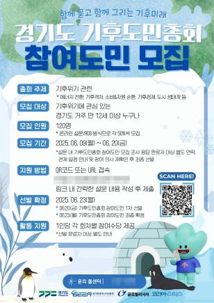 (경기=NSP통신) 김병관 기자 = 경기도가 다양한 계층의 도민이 기후정책 수립 과정에 숙의공론 등으로 직접 참여하는 ‘경기도 기후도민총회’ 참여자를 20일까지 모집한다.