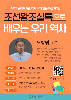 이번 특강은 ‘2025년 중마도서관 역사 주제 인문 특강’의 두 번째 강연으로, 지역 시민들의 역사 이해를 돕고 역사 인문학에 대한 관심을 높이기 위해 마련됐다. 지난 5월에는 임승휘 교수가 ‘유럽 귀족의 역사’를 주제로 첫 강연을 진행해 시민들로부터 큰 호응을 얻은 바 있으며, 이번 강연 역시 높은 관심이 예상된다.