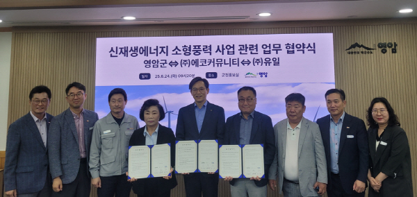 (전남=NSP통신) 강현희 기자 = 영암군(군수 우승희)이 지난 24일 에코커뮤니티, 유일과 ‘소형 풍력발전 공동 추진 업무협약’을 체결했다.