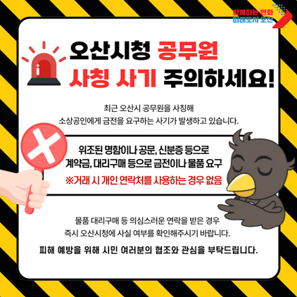 최근 전국적으로 공무원을 사칭해 소상공인에게 물품 대리구매나 계약금을 요구하는 사기 사례가 빈번히 발생하고 있으며 오산시에서도 유사 사례가 잇따라 신고되고 있다.