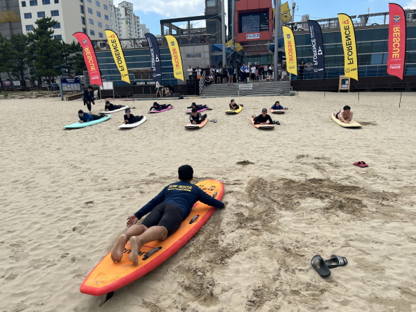 실습훈련에서는 실제 구조보트와 레스큐 튜브를 활용한 해상 인명구조 시연과 함께 서프보드를 이용한 조난자 접근 및 구조법, 익수자 확보 요령 등 서프 존 특화 구조기법이 중점적으로 진행했다.