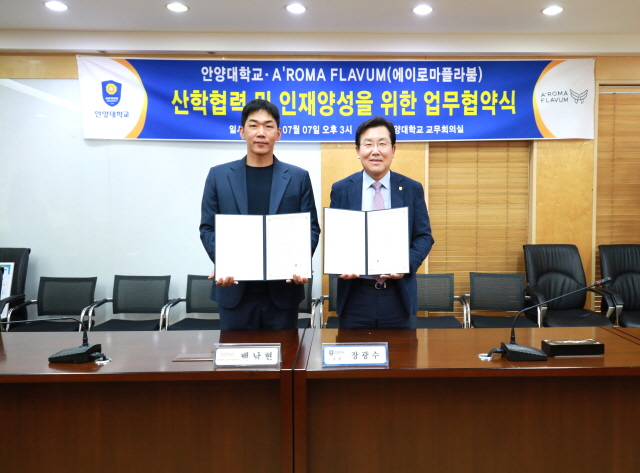 NSP통신-안양대와 에이로마플라붐 간 인력 양성 및 지속 성장 기반 조성을 위한 업무협약식에서 장광수 총장(오른쪽)과 백남현 에이로마플라붐 대표가 협약 기념촬영을 하고 있다. (사진 = 안양대학교)