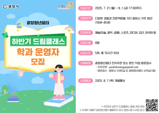오영숙 광양청년꿈터 센터장은 “상반기 드림클래스가 큰 호응을 얻으며 청년들에게 의미 있는 성장의 기회를 제공한 만큼 하반기 운영자 모집에도 많은 관심과 참여를 기대한다”며 “청년들이 강사로서 경험을 쌓고 지역사회에 기여할 수 있는 소중한 기회에 적극 도전하길 바란다”고 말했다.