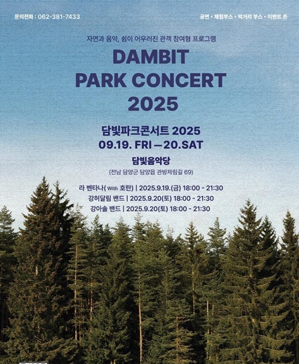 (전남=NSP통신) 김용재 기자 = 담양군문화재단(이사장 정철원·이하 재단)은 오는 9월 19, 20일 이틀간 담빛음악당에서‘2025 담빛 파크콘서트’를 개최한다고 26일 밝혔다.