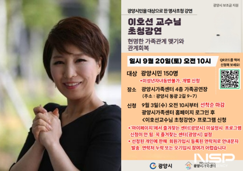 (전남=NSP통신) 김성철 기자 = 광양시가족센터는 오는 9월 20일 센터 4층 가족공연장에서 광양시민을 대상으로 명사초청 강연을 개최한다고 밝혔다.