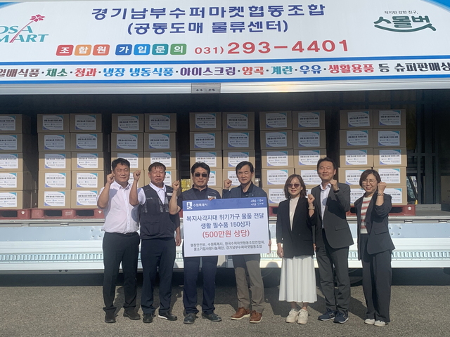 경기남부수퍼마켓협동조합은 지난 9일 행정안전부 스마트복지안전공동체추진단, 중소기업중앙회사랑나눔재단, 한국수퍼마켓협동조합연합회와 업무협약을 체결하고 민관이 함께 위기가구 지원체계를 강화하기로 약속했다. 이번 기부는 업무협약의 하나로 이뤄졌다.