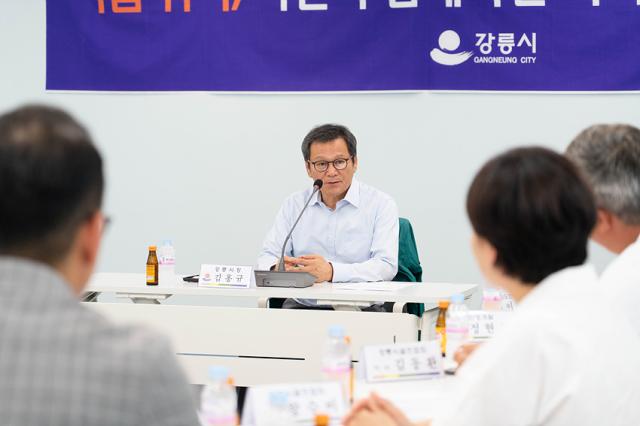 NSP통신-김홍규 강릉시장이 지역 경기 조기 회복을 위해 대책회의를 진행하고 있는 모습. (사진 = 강릉시)