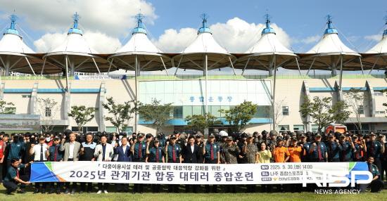 (전남=NSP통신) 김성철 기자 = 전남경찰청은 지난 달 30일 나주종합스포츠파크에서 국가정보원(광주지부), 육군 제31보병사단, 제11공수특전여단, 공군 제1전투비행단, 전남소방본부, 영산강유역환경청 등 10개 기관 250여 명이 참여한 가운데 관계기관 합동 대테러 종합훈련을 실시했다.