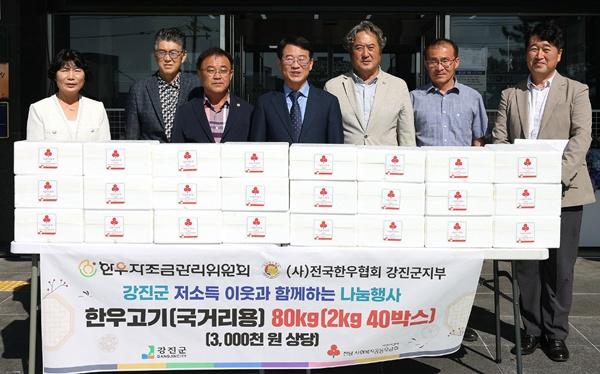 (전남=NSP통신) 김용재 기자 = 한우자조금 관리위원회와 전국한우협회 강진군지부(회장 김은주)가 관내 저소득층 가구에 전달해 달라며 300만원 상당의 한우고기 40박스를 강진군에 1일 기탁했다.