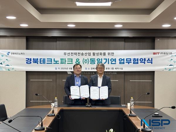 (경북=NSP통신) 김대원 기자 = 경북테크노파크(원장 하인성)가 지난 9월 30일 본원 세미나실에서 동일기연과 무선전력전송 산업 활성화를 위한 업무협약(MOU)을 체결했다.
