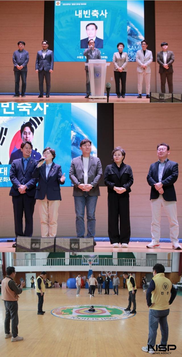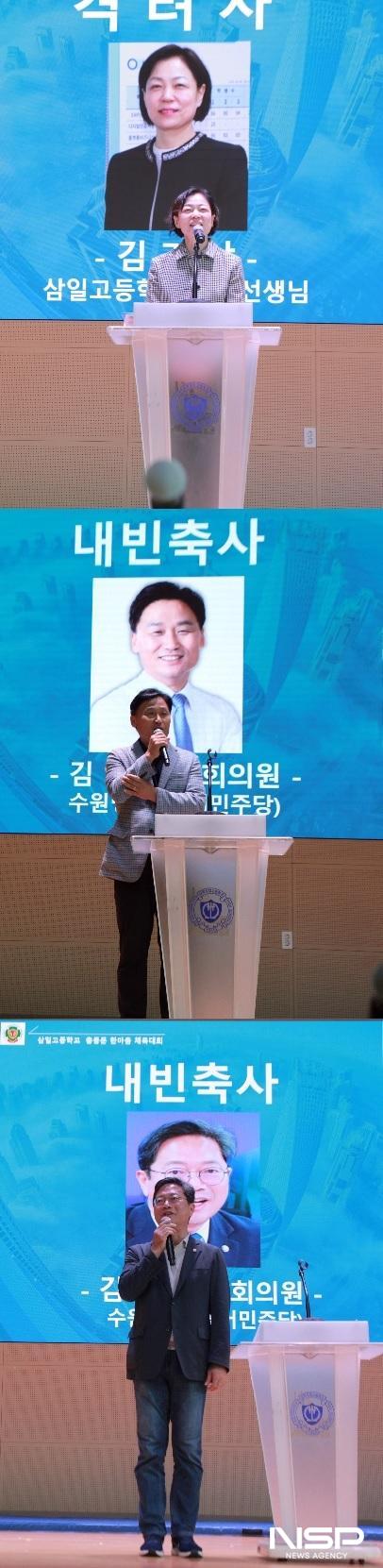 NSP통신-사진 위쪽부터 김기남 삼일고등학교 교장의 격려사, 김영진 국회의원의 축사(가운데), 김승원 국회의원의 축사 모습. (사진 = 김종식 기자)
