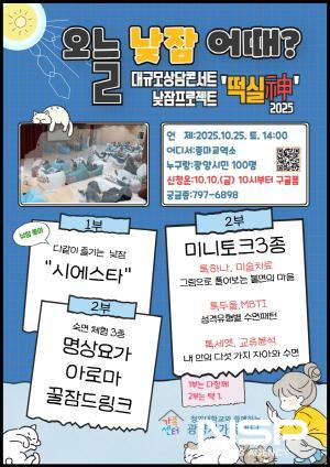 ‘낮잠 프로젝트 떡실神’은 바쁜 일상 속 수면 부족과 스트레스로 지친 시민들에게 ‘쉼을 통한 회복’을 선물하기 위해 마련된 집단상담 프로그램이다.