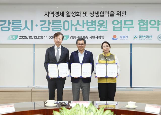 협약식은 13일 강릉시청 시민사랑방에서 열렸으며 김홍규 시장과 유창식 강릉아산병원장, 이은경 강릉아산병원노동조합위원장이 참석했다.
