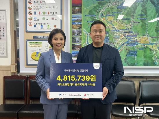 (전남=NSP통신) 김성철 기자 = 카카오모빌리티가 지난 달 30일 구례군과의 공유자전거 이용 활성화를 위한 업무 협약의 일환으로 공유자전거 수익금 481만 5739원을 구례군에 기탁했다고 밝혔다.