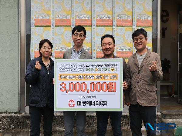(경북=NSP통신) 김대원 기자 = 대성에너지(117580)는 14일 대구 서구 행복나눔의 집을 찾아 ‘2025 자원봉사능력개발원 후원행사 - 쓰담쓰담 : 마음을 쓰고 희망을 담다’ 행사에 앞서 후원금 300만원을 전달했다.