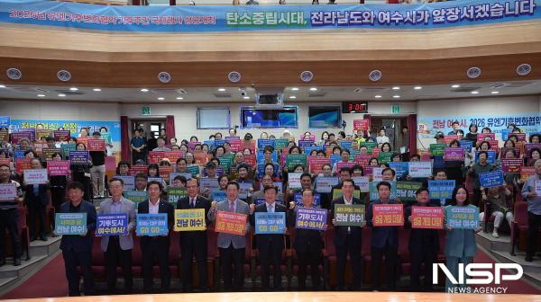 (전남=NSP통신) 서순곤 기자 = 여수시는 지난 14일 진남문예회관에서 ‘2026년 유엔기후변화협약(UNFCCC) 기후주간(Climate Week)’ 국내 개최 후보지 선정을 기념하는 행사를 열고 유치를 위한 의지를 다졌다.
