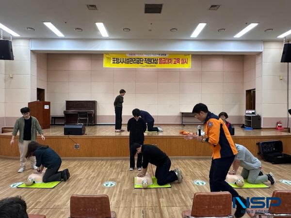 NSP통신-포항시시설관리공단은 전 직원의 응급대응 능력 향상을 위해 포항북부소방서 전문강사를 초빙해 노인복지회관 강당에서 공단 직원 40명을 대상으로 응급대처 교육을 실시했다. (사진 = 포항시시설관리공단)
