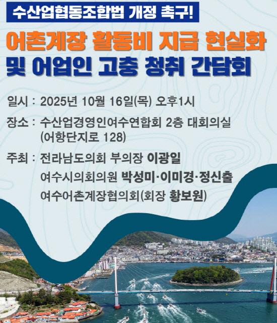 전라남도의회 이광일 부의장과 여수시의회 박성미·이미경·정신출 의원, 황보원 여수어촌계장협의회장이 공동으로 주최한다.
