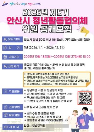 시는 제5기 청년활동협의체 위원으로 총 50명을 모집한다. 공고일 기준으로 안산시에 거주하거나 안산시에서 활동 중인 19세~39세 내·외국인 청년이라면 누구나 지원이 가능하다.