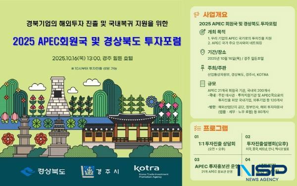 이번 포럼은 APEC 주요 회원국과 국내기업이 함께 참여하는 글로벌 투자 교류의 장으로 경주를 중심으로 신규 투자 프로젝트를 발굴하고 경북지역 외국인 투자 활성화와 국내 복귀기업 유치를 목표로 추진된다.