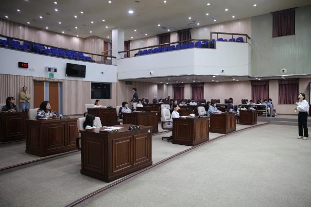 경기 군포시의회(의장 김귀근)는 15일 지역 내 당동초등학교 학생자치회 소속 학생 30명이 참여한 모의의회를 개최했다.