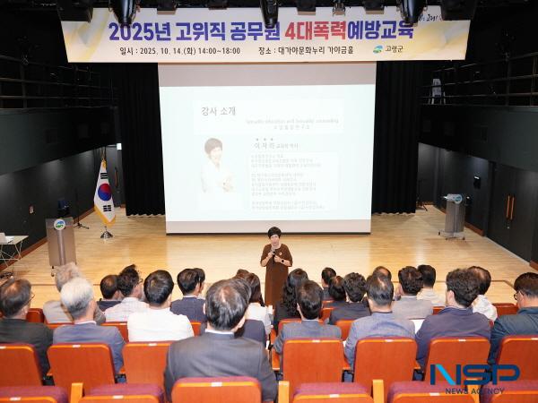 (경북=NSP통신) 김대원 기자 = 고령군(군수 이남철)은 지난 14일 문화누리 가야금홀에서 이남철 군수를 비롯한 고위직 공무원 37명을 대상으로 4대 폭력(성희롱, 성폭력, 성매매, 가정폭력) 예방교육을 실시했다.