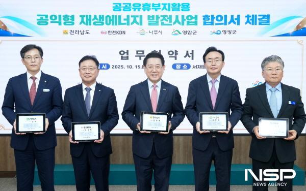 전남도는 지난 15일 도청에서 나주시, 영암군, 영광군, 한전KDN과 함께 ‘공익형 재생에너지 발전사업 업무협약’을 체결했다고 밝혔다. 이번 협약식에는 김영록 전남도지사, 윤병태 나주시장, 우승희 영암군수, 장세일 영광군수, 박상형 한전KDN 대표이사가 참석했다.