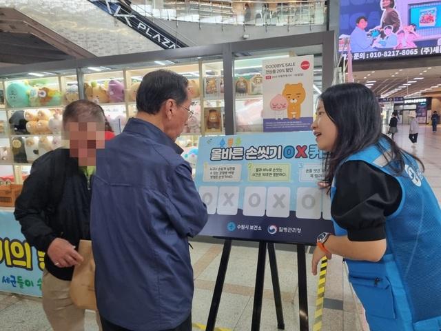 (경기=NSP통신) 조현철 기자 = 경기 수원시보건소가 ‘세계 손씻기의 날’(10월 15일)을 맞아 15일 수원역 2층 대합실에서 감염병 예방 캠페인을 펼쳤다.