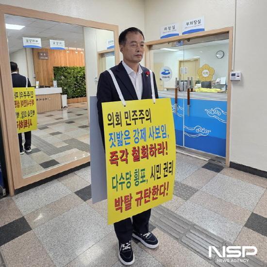 NSP통신-송하진 의원이 여수시의회 의장실 앞에서 자신의 상임위원회 사·보임 결정을 강하게 비판하는 피켓 시위를 벌이고 있다. (사진 = 송하진 의원)