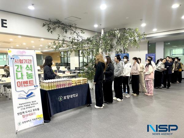 (경북=NSP통신) 조석현 기자 = 포항대학교(총장 하민영) 학술정보관은 지난 20일 학술정보관 내 북카페에서 시험 기간을 맞이해 ‘간식 지원 행사’를 진행했다.