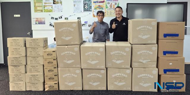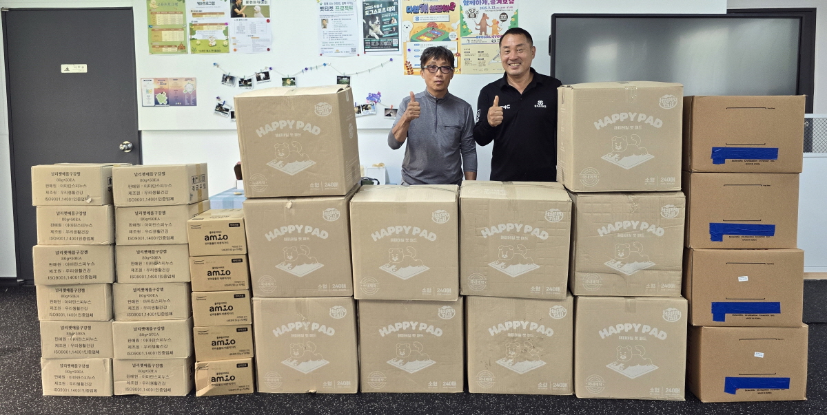 이웅종 대표가 모 방송에서 소개됐던 ‘아파트에 32마리 반려동물과 함께 사는 남자’의 주인공에게 반려용품과 패드, 간식 등을 기부하면서 기념촬영 하는 모습. (사진 = 김종식 기자)
