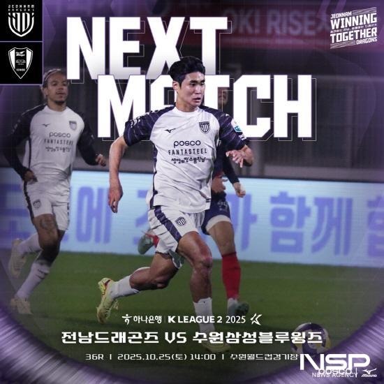 (전남=NSP통신) 김성철 기자 = 전남드래곤즈가 오는 10월 25일 토요일 오후 2시 수원월드컵경기장에서 열리는 하나은행 K리그2 2025 36라운드 수원삼성블루윙즈 원정에 나선다.