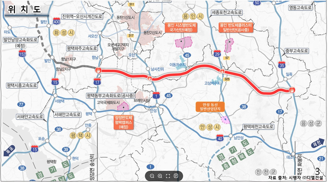 이번 고속도로는 화성시 양감면에서 시작해 평택시, 용인시를 거쳐 안성시 일죽면까지 연결되는 총연장 45.3km 구간으로 왕복 4~6차로 규모로 조성된다.