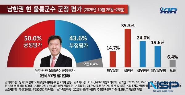 한편 남한권 현 울릉군수의 군정 평가 조사에서는 긍정 50.0%, 부정 43.6%로 나타났다.