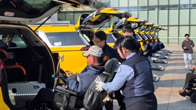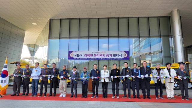 NSP통신-29일 성남시청 앞 광장에서 열린 장애인 복지택시 증차 발대식에서 시승 행사가 진행되고 있다. (사진 = 성남시)