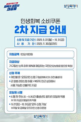 (경기=NSP통신) 조현철 기자 = 경기 화성시(시장 정명근)가 31일 오후 6시 ‘민생회복 소비쿠폰’ 2차 신청이 마감됨에 따라 시민들이 혜택을 놓치지 않도록 적극적인 신청을 당부했다.