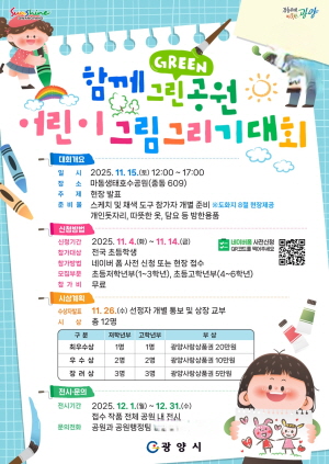 (전남=NSP통신) 김성철 기자 = 광양시는 오는 11월 15일 오후 12시~5시까지 마동생태호수공원에서 ‘2025 광양시 함께 Green 공원 어린이 그림그리기 대회’를 개최한다고 밝혔다.