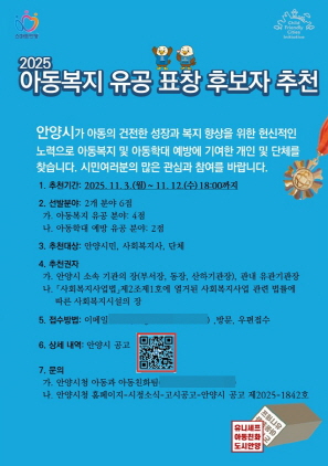 (경기=NSP통신) 서국현 기자 = 경기 안양시(시장 최대호)는 오는 12일까지 아동의 건전한 성장과 복지 향상에 헌신한 시민과 단체를 발굴 및 격려하고자 ‘아동복지 유공 표창’ 후보자를 추천받는다.