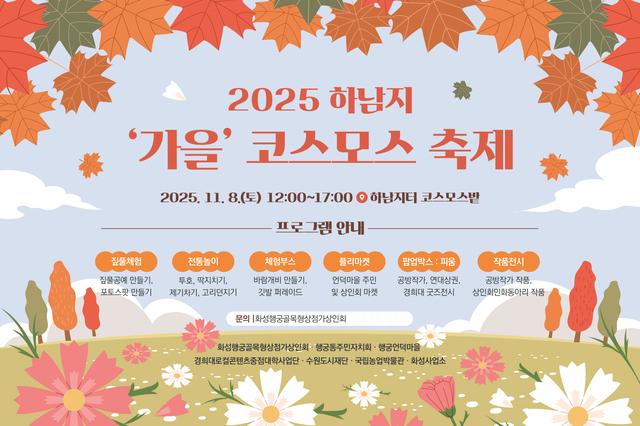 하남지 가을 코스모스 축제는 화성행궁골목형상점가상인회가 주관하고 행궁공방거리상인회·언덕마을 작가·행궁동주민자치회·경희대학교 로컬콘텐츠중점대학사업단·수원도시재단·국립농업박물관 등 기관들이 협업한다. 행궁동 지역 영상 작가들은 이날 축제를 촬영해 기록을 남길 예정이다.
