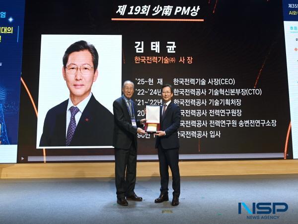 (경북=NSP통신) 김대원 기자 = 한국전력기술(사장 김태균, 이하 ‘한전기술’) 김태균 사장은 지난 7일 한국과학기술회관에서 한국프로젝트경영협회(KPMA) 주관으로 개최된 제35회 PM심포지엄에서 ‘제19회 少南PM상’을 수상했다.